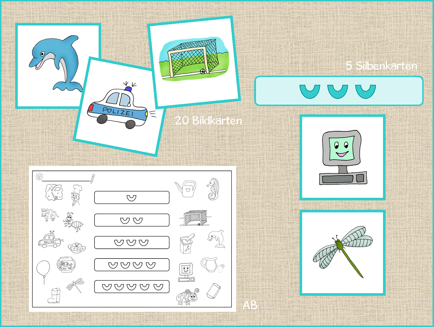 Ein Klassiker im Vorkurs: Silben klatschen und Bildkarten entsprechend sortieren. Ich habe ganz gute Erfahrungen damit gemacht, erst gemeinsam die Wörter zu klären und große Bildkarten zu sortieren, bevor die Kinder dann noch einmal alleine am Arbeitsblatt arbeiten. So sieht man dann auch ganz gut, welche Wörter sich die Kinder schon merken können, z.B. Libelle ist ja nicht unbedingt bekannt. Damit auch alle Kinder mehrfach dran kommen, habe ich insgesamt 20 Bildkarten erstellt, die man aber bestimmt auch kleiner ausdrucken kann als A5. Viel Spaß damit! 😀