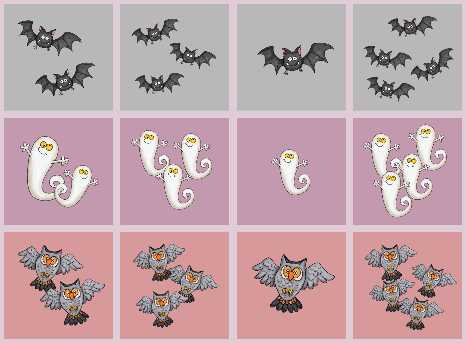 ein Memo-Spiel: Immer zwei Karten mit dem gleichen Bild, die 5 ergeben, gehören zusammen. Also z.B. die Fledermauskarten 2+3 und 1+4.