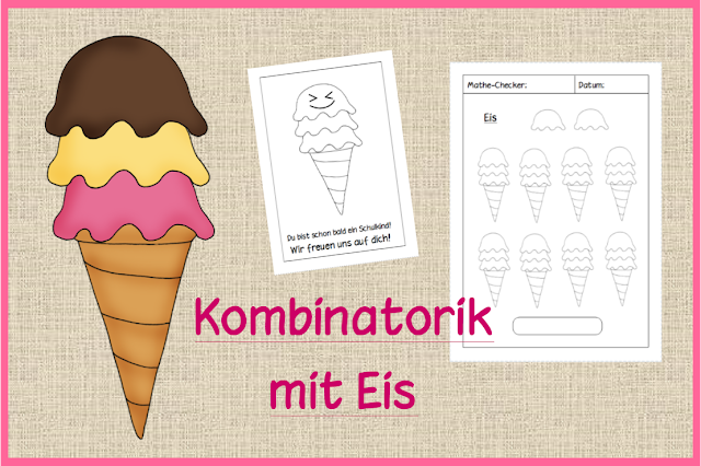 Für den Besuch der Kindergartenkinder habe ich eine Kombinatorik-Einheit zu Eis geplant. Die Kinder sollen gemeinsam knobeln, wie viele Möglichkeiten es gibt, sein Eis zusammen zu stellen. Im Material enthalten sind Tafelmaterial, Legematerial, 3 ABs mit unterschiedlichen Aufgabenstellungen und ein Namens-/Willkommensschild für die Kindergartenkinder.